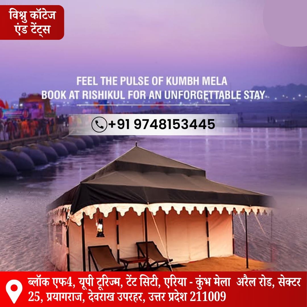 विश्नु कॉटेज एंड टेंट्स, ब्लॉक एफ4, यूपी टूरिज्म, टेंट सिटी, एरिया – कुंभ मेला अरैल रोड, सेक्टर 25, प्रयागराज, देवराख उपरहर, उत्तर प्रदेश 211009